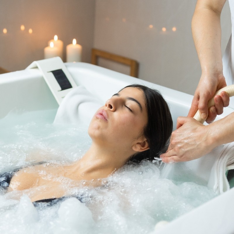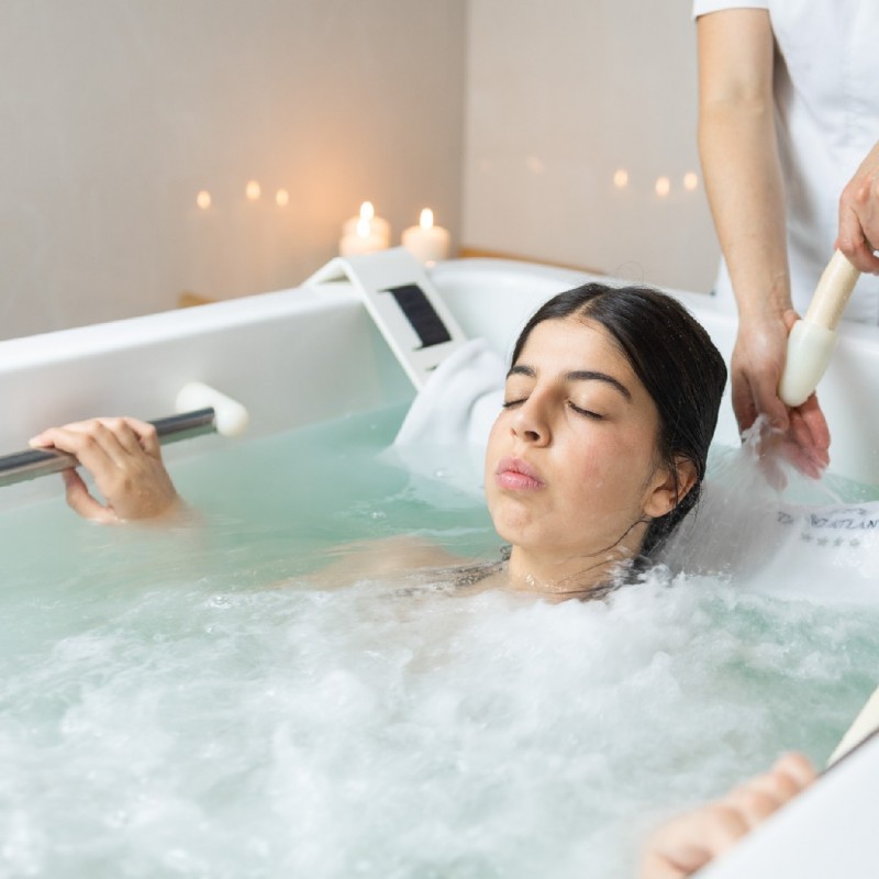 Una sesión de Bañera Subacuática con agua de mar con masaje bajo el agua por terapeuta con chorro para una persona.